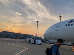 搭乗は定刻。上海行きの便は、ゲート横づけではなく、バス移動なので少々面倒だ。ただ、搭乗前の夕焼けは綺麗だった。