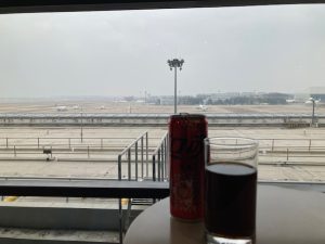 出発前に朝食をしっかり取ったので、ラウンジでは何も食べず。珍しくコーラを飲みたくなったので(こうした炭酸飲料を飲むのは、1年に2~3回程度。通常は、水、炭酸水、お茶の何れか)、ダイエットコークを飲み時間を潰す。