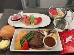 機内食は洋食。日本酒を併せた。前回のJAL便で飲んだ加茂錦が有ったので、今回も有難く頂く。年齢が上がると共に、酒の向き不向きがはっきりしてきた。ワインを飲むと、頭が痛い、翌日に残る等になりやすい。結局、僕の身体に合った日本酒を飲むのが一番よいと思い、食事を問わず日本酒を飲むことが多くなった。年齢が上がると身体がわがままになる。